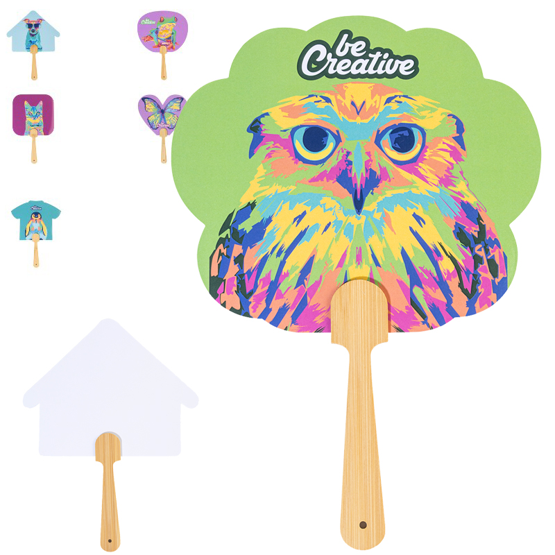 Custom made waaier met bamboe handvat en gelamineerd papier.
