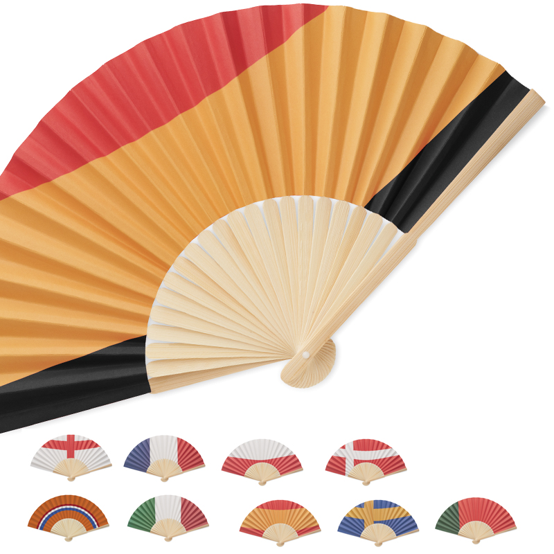 Handmatige handventilator van bamboe met vlagontwerp op papieren stof.