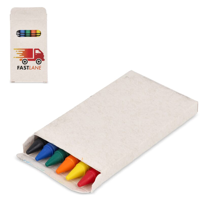 Een set van 6 levendige krijtjes, netjes verpakt in een gerecyclede melkpakdoos.