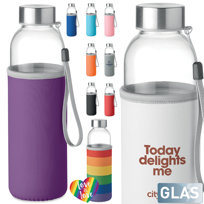 Glazen drinkfles met neopreen tasje.
