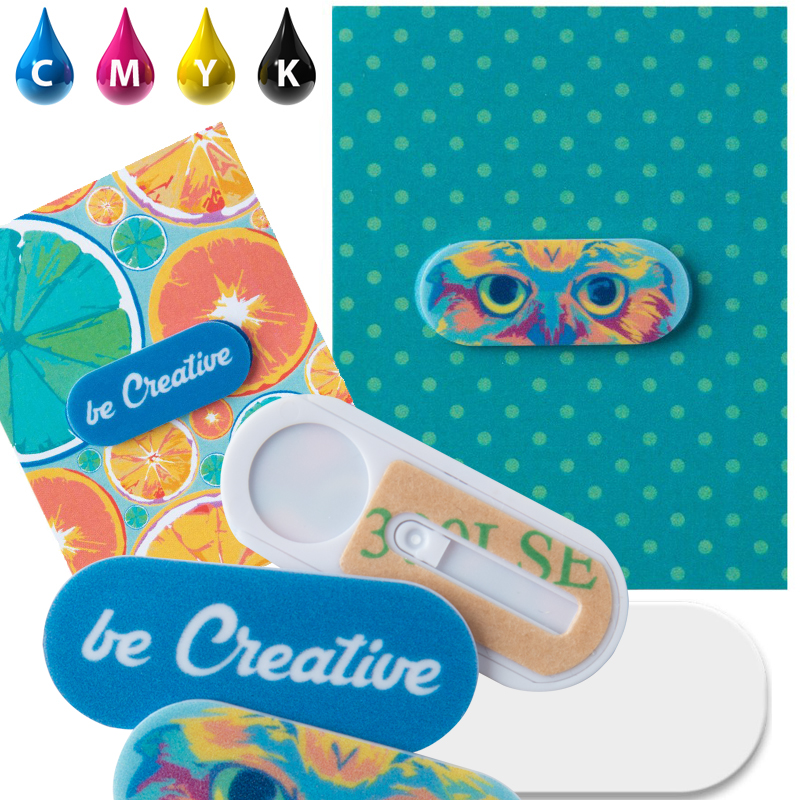 Zelfklevende custom made full colour bdrukte plastic, anti–spy webcam blocker met verplaatsbare cover.