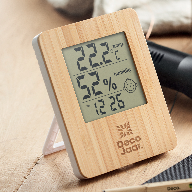 Weerstation met bamboe voorkant en multifunctionele thermometer.