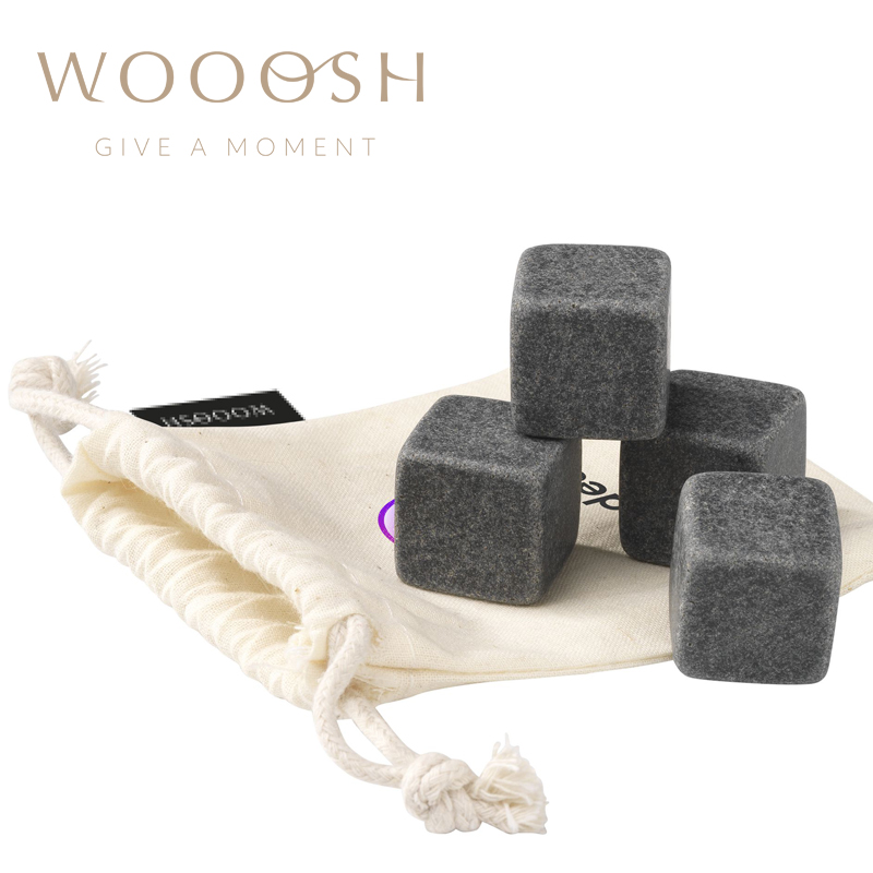 Deze set van 4 herbruikbare, granieten ijsblokjes van het merk Wooosh is perfect voor het koelen van een drankje, zonder dat het verwatert.