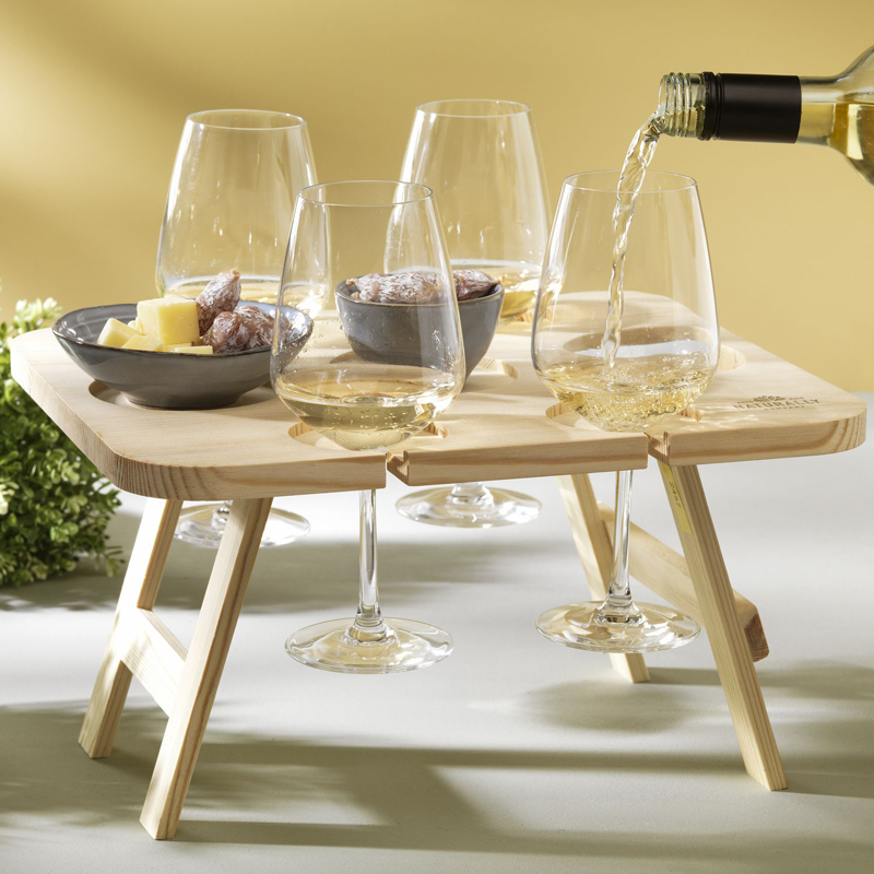 De tafel heeft 4 uitsparingen om wijnglazen in te hangen, een houder voor een wijnfles en 2 inkepingen voor tapasschaaltjes.