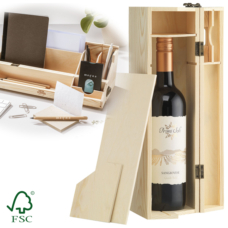 Rackpack: een wijngeschenkkist van FSC hout met een nieuw tweede leven.