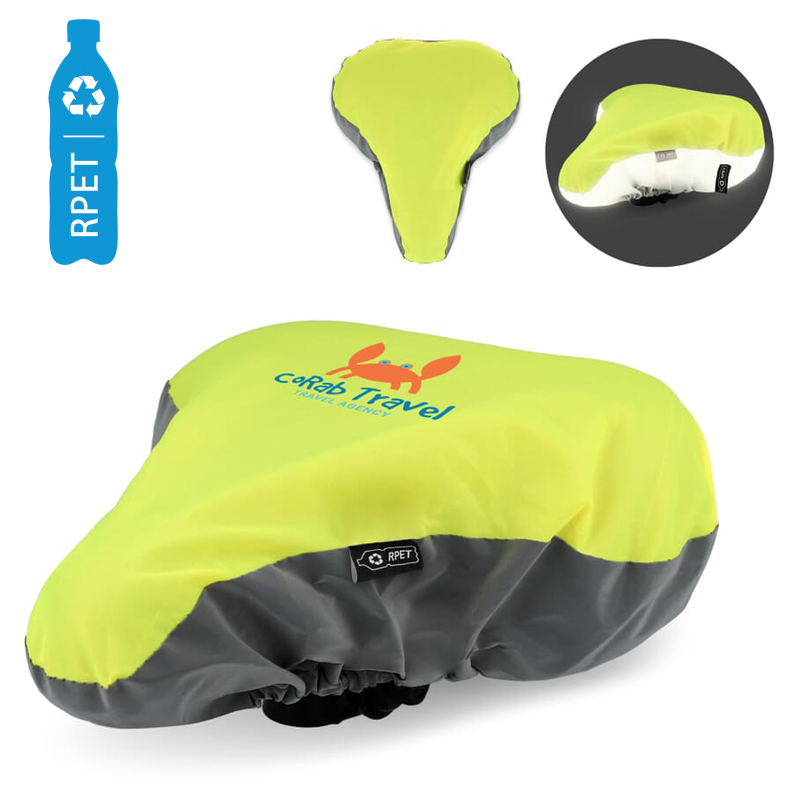 Fietszadelhoes gemaakt van gerecycled PET-materiaal met een reflecterend gedeelte voor betere zichtbaarheid bij weinig licht.