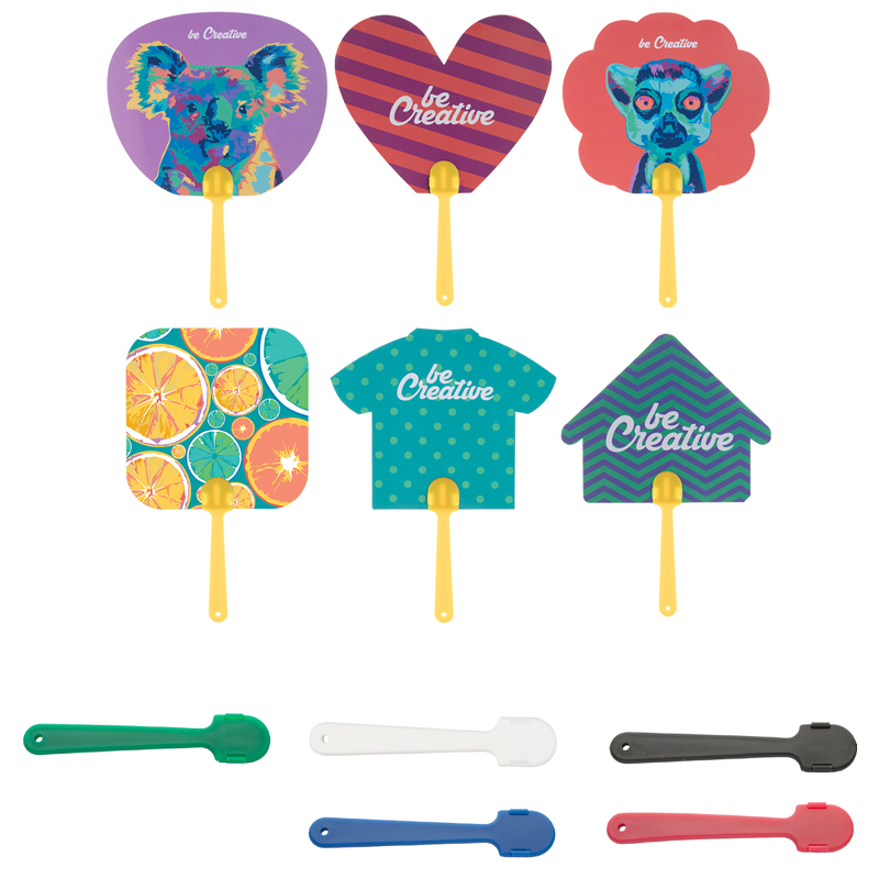 Custom gemaakte waaiers met plastic handvat en gelamineerd papier.
