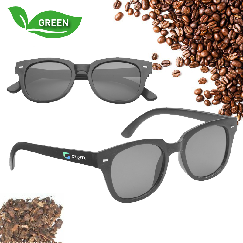 Een zonnebril met een frame gemaakt van koffiedik en pijnboomschorsvezels.